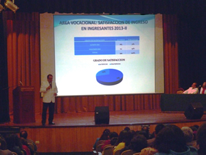 Ésta última estuvo a cargo del Lic. Jhony Atencio quien brindó una charla motivadora, haciendo uso de dinámicas y juegos, durante la cual explicó a los padres cuán importantes era su participación en el desarrollo personal y profesional de sus hijos ingresantes. La evaluación psicológica consideró los siguientes puntos: área familiar donde se obtuvo una percepción sobre la dinámica familiar de los ingresantes, que resultó ser mayoritariamente adecuada (79%), área socio emocional, en la que se detectó el nivel de autoestima, motivación, relaciones interpersonales, y aspectos sentimentales del alumno, así la mayoría (77%) muestra tener una madurez emocional buena, sin embargo se detectó un porcentaje de estudiantes introvertidos y con ansiedad; en el área vocacional (mediante la cual se logró obtener información sobre su actual estado de satisfacción de ingreso) se detectó que si bien el 71% se muestra satisfecho con la carrera elegida, otro 29 % afirma tener el deseo de realizar su respectivo traslado; finalmente se indagó acerca de la prevalencia de consumo de sustancias psicoactivas, y uso y/o abuso de internet, aunque la mayoría ingiere alcohol en ocasiones 66% solo un mínimo porcentaje ha hecho uso de alucinógenos (1%). |
