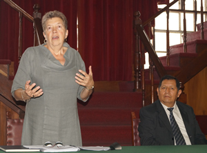 Durante su turno, la representante del VLIR -la Dra. Carpenter- destacó la cooperación bilateral entre nuestros países, esto con el objetivo de fomentar el desarrollo económico y combatir la pobreza. Recordó el vínculo de cooperación que nos une en torno a tres puntos: apoyo a la Política de Aseguramiento Universal en Salud; Desarrollo Económico y Sostenible y Gestión Estratégica de los Recursos Naturales; y Consolidación Democrática y Derechos Humanos. |