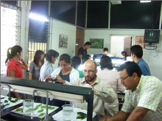 Estudiantes del Diplomado realizando ensayos toxicológicos por el método de inmersión de hojas