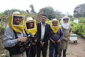 (2015, Agosto 12).-El Departamento académico de Entomología de la Facultad de Agronomía de la UNALM maneja un apiario conformado por 50 colmenas con más de 25 mil unidades en cada una. Al llegar los visitantes del programa televisivo tuvieron que ponerse el vestuario de protección para evitar posibles picaduras.
