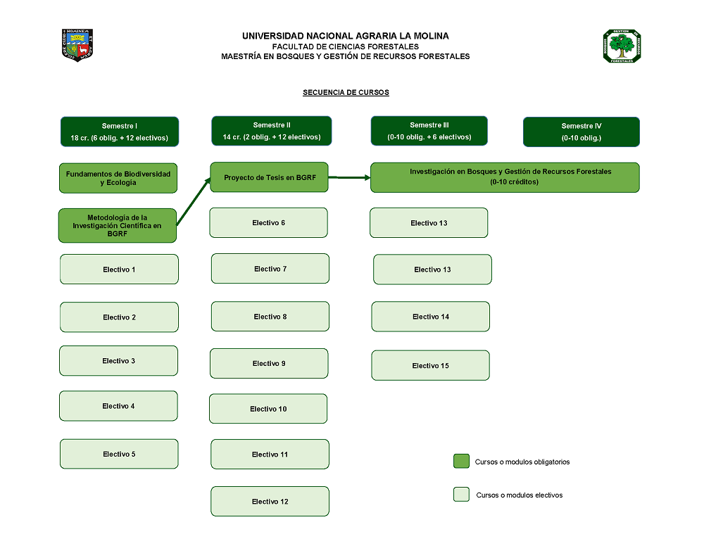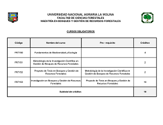 El Programa de la Maestría en Bosques y Gestión de Recursos Forestales (MBGRF) cuenta con un plan de estudio conducente al Grado Académico de Maestro denominado Magister Scientiae (Mg.Sc.) en Bosques y Gestión de Recursos Forestales. Según el Artículo 97° de la RESOLUCIÓN N° 0005–2019-CU-UNALM establece que para otorgar el Grado Académico de Maestro denominado Magister Scientiae (Mg. Sc.), un estudiante debe aprobar 48 créditos de un plan de estudios durante 4 semestres académicos (Reglamento General UNALM Art. 153°). |