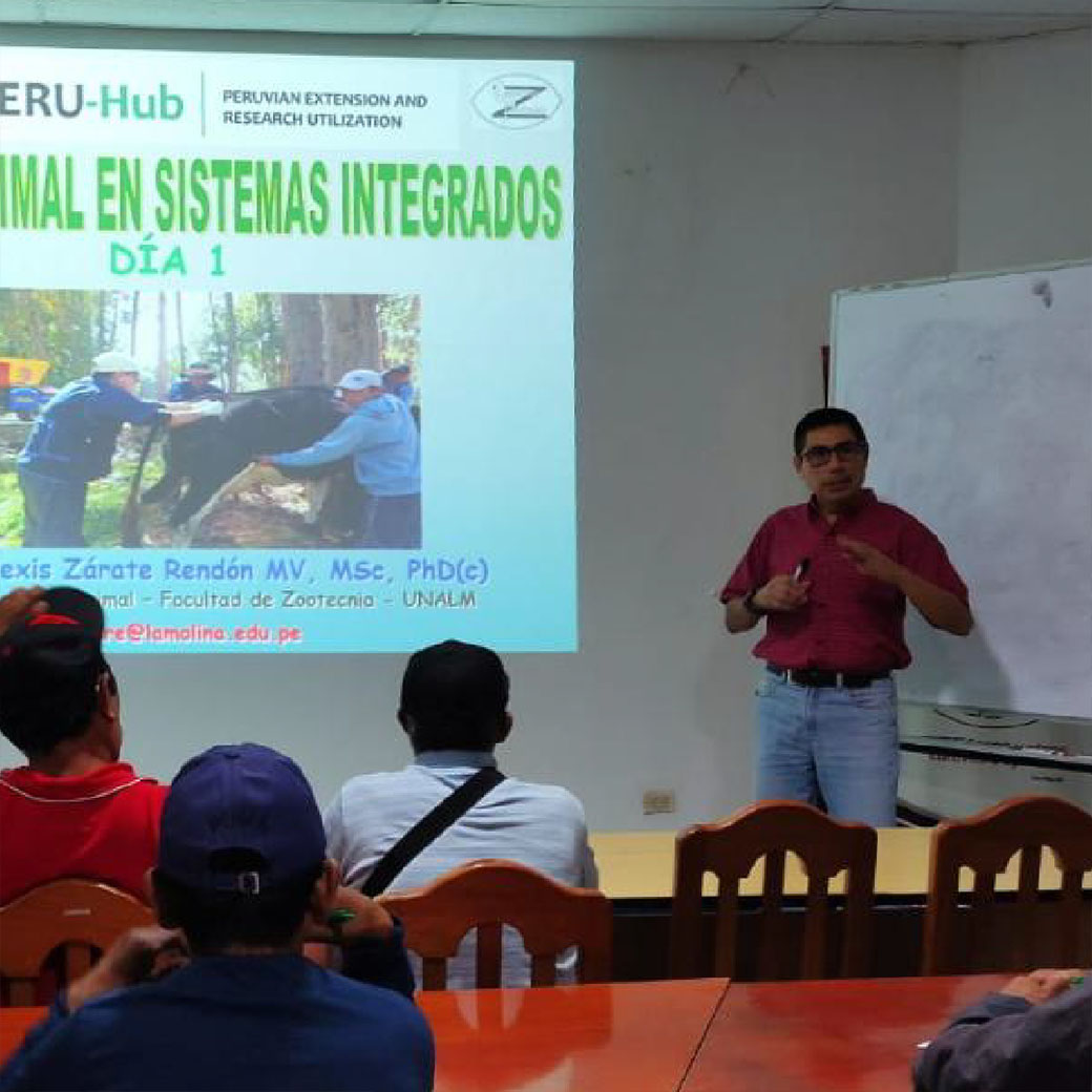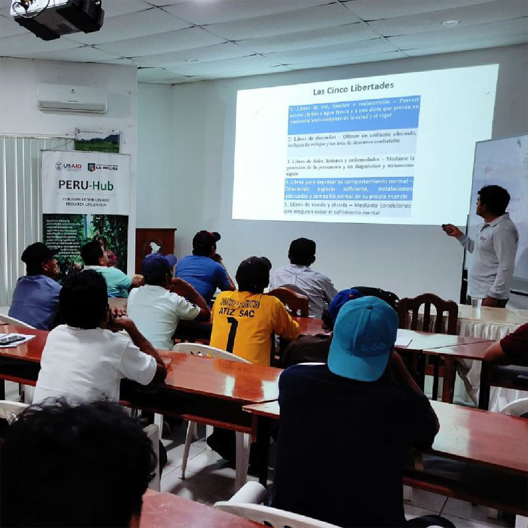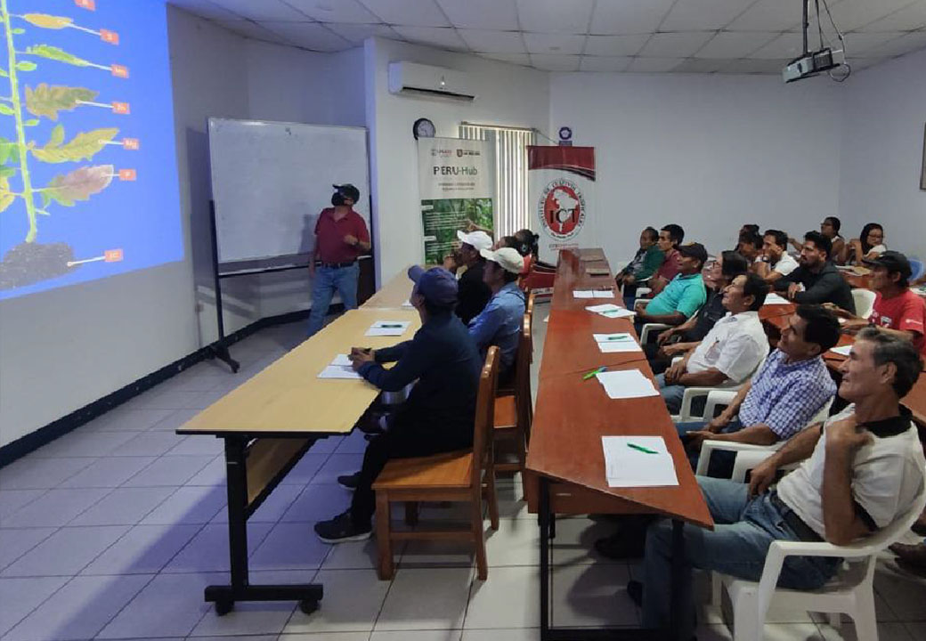 En la ciudad de Tarapoto se desarrollaron los talleres de Ganadería y Agricultura en Trópico, organizados por PERU-Hub bajo la dirección del Ing. Esteban Altamirano, coordinador del Componente de Extensión. Los talleres fueron dirigidos a productores de la Región San Martín con la finalidad de enriquecer sus conocimientos en sanidad animal y gestión de suelos, así como también en temas relacionados al control de plagas y enfermedades en el cultivo de cacao.