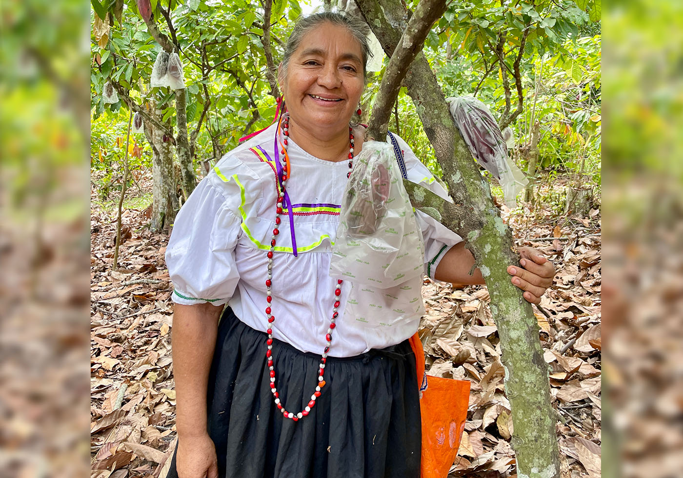 La primera parada fue en la comunidad de Copal Sacha, ubicada en el distrito de San José de Sisa (Lamas), donde la agricultora Delly Neyra mostró con entusiasmo el incremento de su cosecha de cacao en un aproximado del cien por ciento gracias a la técnica del embolsado de las mazorcas, actividad aprendida en las ECA de PERU-Hub, la cual tiene como objetivo evitar el ingreso de plagas y enfermedades en los frutos.