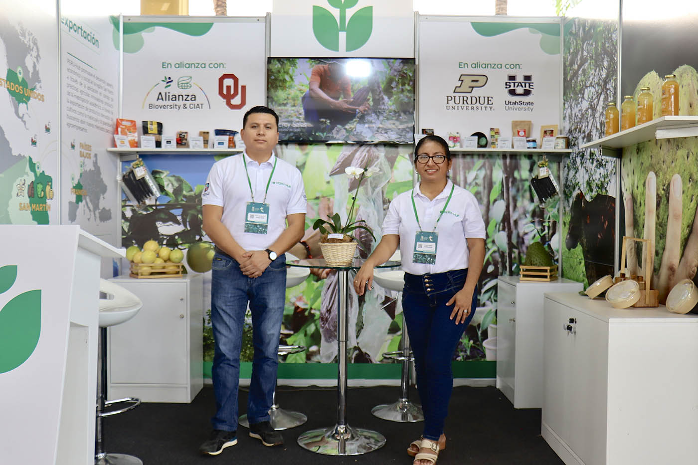 Christian Marcelo e Yliana García, coordinador y especialista del componente de Extensión respectivamente, en el stand de PERU-Hub.