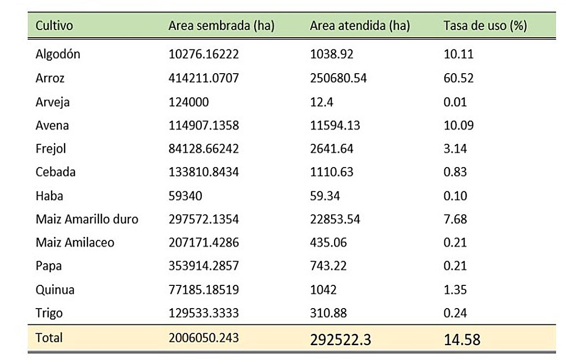 Es un problema casi general. Cultivos de exportación como café y cacao no usan semilla certificada. Solo cultivos como arroz y maíz amarillo duro (MAD) usan semilla certificada entre 60 y 10 % respectivamente. Por esa razón el arroz es un cultivo exitoso en el país en términos de productividad.