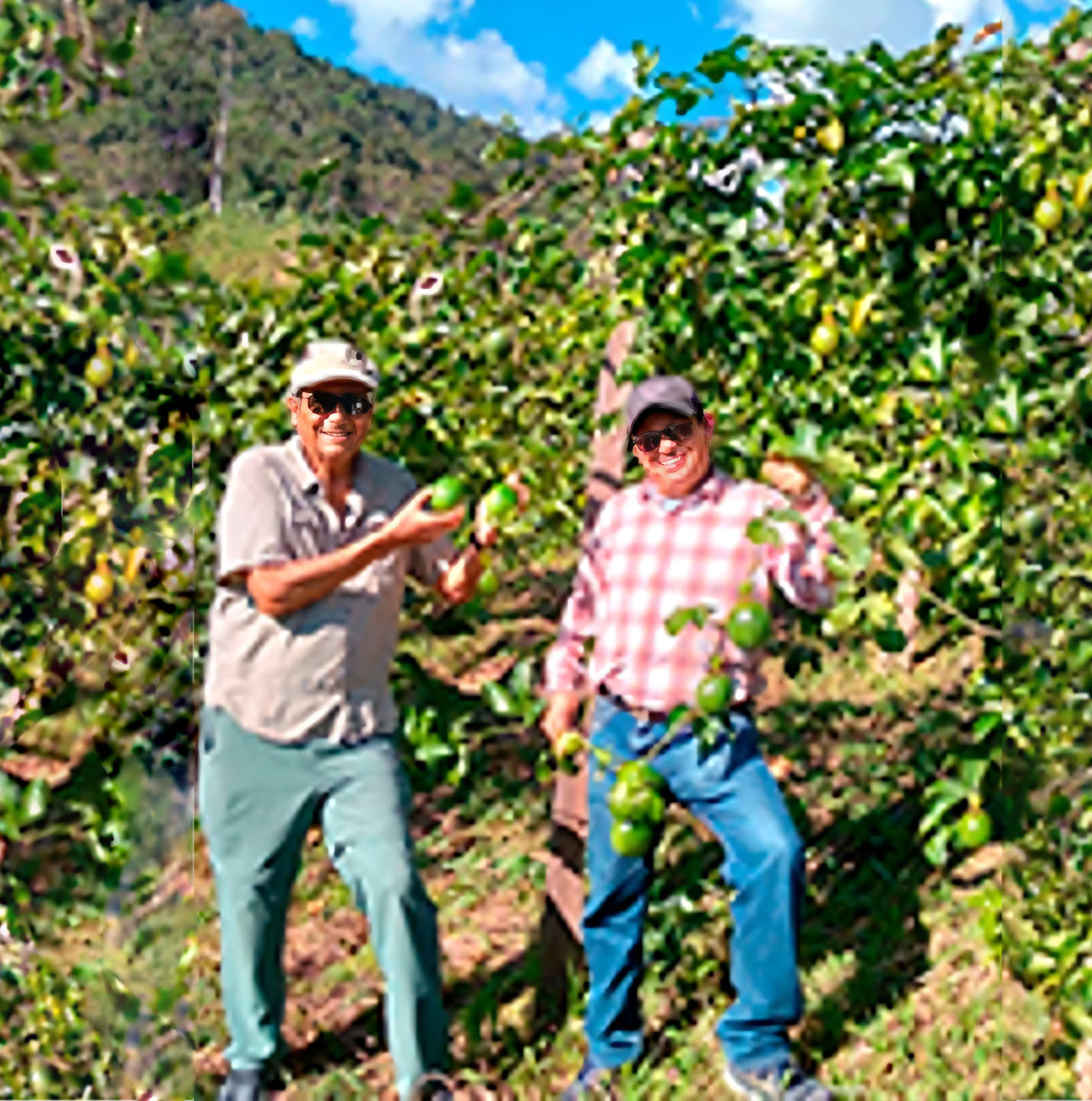 El Dr. Raúl Blas, investigador Principal de Cultivos de PERU-Hub (der.) al lado del Dr. Hugo Villachica, director de PERU-Hub, en una visita a una parcela de cultivos de maracuyá, en el distrito Río Negro, en Satipo.